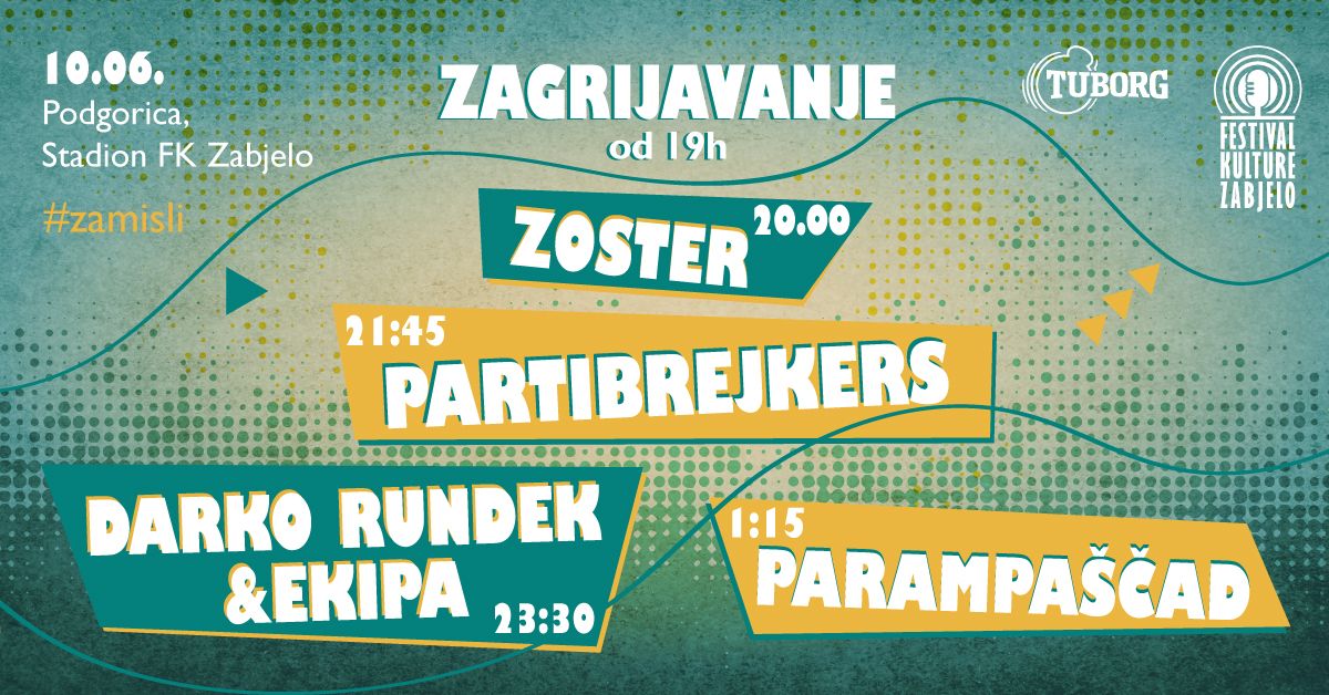 Podsjetimo, Festival kulture Zabjelo se ove godine održava po prvi put. Na njemu će 10.juna nastupiti: Zoster, Partibrejkers, Darko Rundek i Ekipa i Parampaščad, i to upravo ovim redosljedom. Osim lokacije, stadiona FK Zabjelo, ono što ovaj festival karakteriše je njegov društveno-odgovorni karakter. Naime, dio prihoda od prodaje ulaznica će biti proslijeđen Fudbalskom klubu Zabjelo i Fondaciji Bajkeri dobre volje. Redovna cijena ulaznice iznosi 15 eura, dok će na dan festivala cijena biti 20 eura. Više informacija je dostupno na zvaničnim Facebook i Instagram nalozima Festivala kulture Zabjelo.